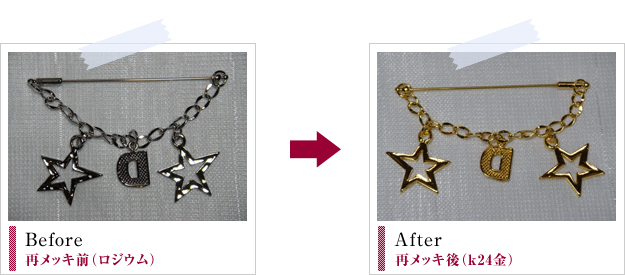 - パール、エメラルドなど、付いている宝石の種類によっては、メッキ加工ができない場合もございます。